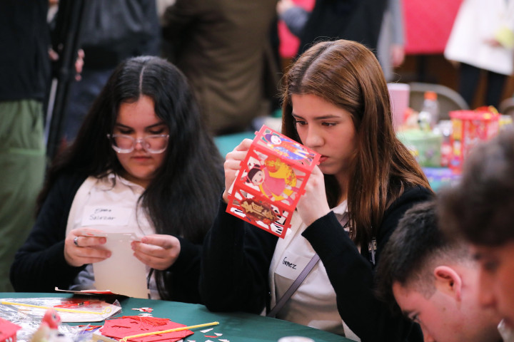 2月12日,美国学生在中国驻洛杉矶总领馆体验制作灯笼。(新华社)